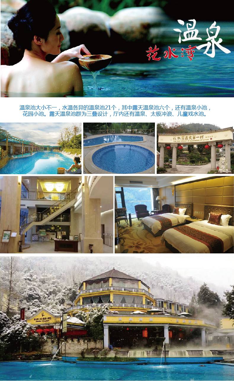 有温泉广场大三叠温泉游泳池、温泉大厅小三叠烫泉、冲浪、儿童戏水池,以及别墅花园式温泉池,单间池等。花水湾温泉是古海水药泉,形成于白垩季或三叠季四川盆地海陆变迁时期,经地矿、卫生权威部门的检测,水温高达68℃,是珍稀的纯天然高温高矿化复合型古海水药泉,具有极高的医疗保健价值,对关节筋骨、运动创伤、胃肠腑脏、微循环系统、植物神经系统、肌体皮肤等疾病具有综合治疗保健效果。