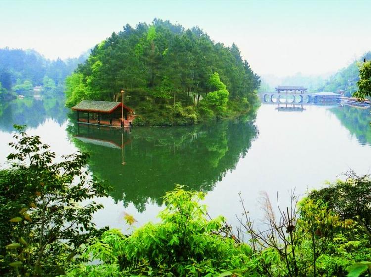成都邛崃竹溪湖是一座人工水库,建在邛崃市南河一级支流竹溪沟上, 距邛崃市区8公里,湖似妆镜,山如眉黛。处于佛教丛林鹤林禅院与密宗福地盘陀寺之间,有省级保护文物单位唐代的花置寺、摩崖造像等。宋代陆游、文同在邛时常游于此。原国防部长张爱萍将军于1985年莅临,挥毫题写“竹溪湖”三字,镌刻在水库大坝左侧石碑上。