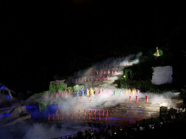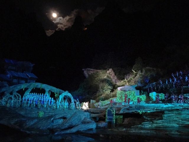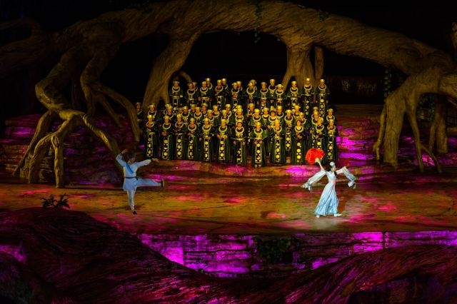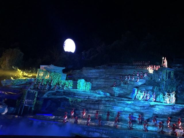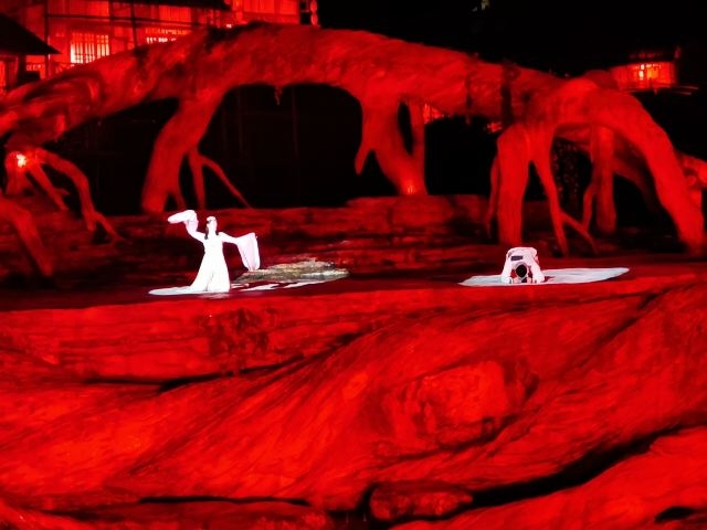 剧中的中心舞台搭建在溪谷之上,望之就如一颗横卧的古树浮于涓涓溪流之上,与周围的天然山石完美相融。舞台面积总10000平方米,不仅是目前全球超大的演出舞台,而且全部采用玻璃钢设计,灯光照射下通体透亮、色彩变换,营造出一幕幕令人惊异的奇幻场景。