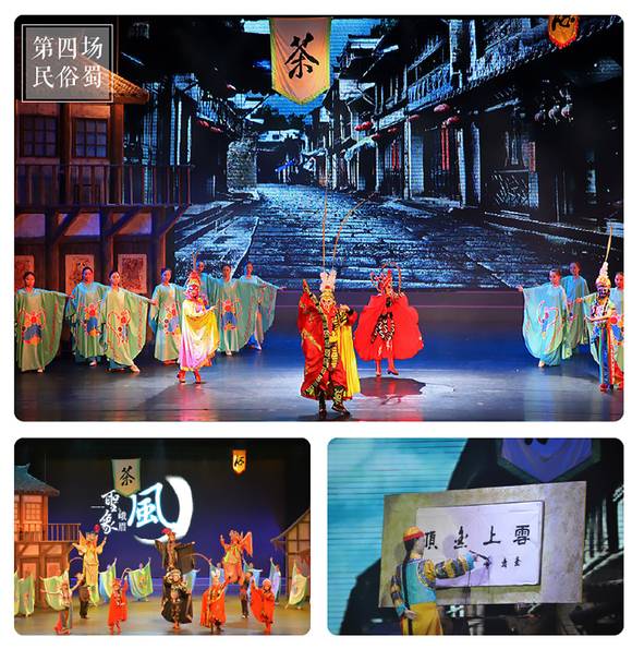 原滋原味的川西民居,带你走进四川地地道道的小镇风情,感受世代生活在这里勤劳善良的人民和纯朴的民风。川剧是中国戏曲中一个古老剧种,300多年的历史,川北灯戏更是土生土长的川剧流派之一,《滚灯》是灯戏的传统代表剧目。 一方印染不尽峨眉秀色,一支笔描不完仙山景象。木偶书艺出神入化的演出震撼人心。变脸是川剧艺术中既神奇又好看的绝活儿,川剧艺术家们用瞬间变化出五颜六色的脸谱来反映人物内心世界的变化。在《圣象峨眉》的舞台上,艺术家们所表演的真人变脸已是绝活,而木偶变脸,更是绝活儿中的绝活儿。